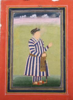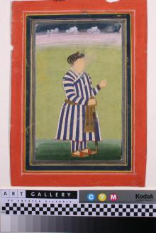 Descriptionside view of a standing male firgure enclosed within a black and orange frame-like element with white and yellow lines detailing it. Figure wears a blue and white striped robe, has one hand (left proper) lifted and holds a sword in the other hand.Status