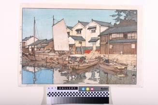 Descriptioncoastal or river scene in Japan; sail and other wooden boats docked in front of housesStatus