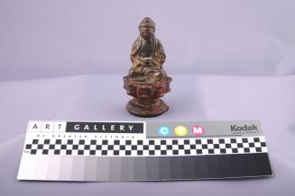 DescriptionBuddha on a lotus base raised on round waisted stand; seated in dhysanasana holding patra in his hands; red lacquer on lotus base; post protuberance from back of figureStatus