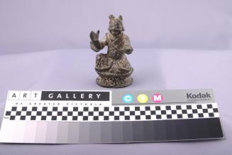 Descriptionimage of a kneeling boy, on a double lotus, with one hand raised at shoulder & the other arm flexed; cylinder attached on backStatus