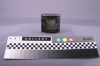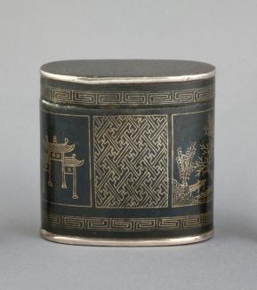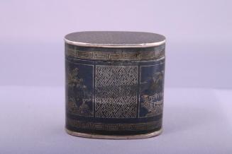 DescriptionOblong lidded box with rounded sides is of black enamel (niello) with a gold coloured design. Each side has a geometric panel flanked by 2 scenes of landscape or architecture. Lid is patterned with the same geometric design. Another bank of geometric design around the lower lid and the lower body.Status