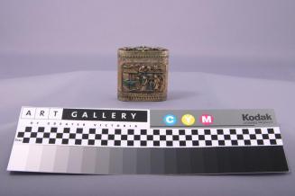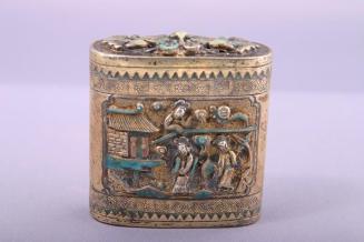 DescriptionLidded oblong box with rounded sides has a raised panel design on each side consisting of figures and a building. Lid also has a raised design with 2 coins at centre at one edge. Turquoise and lavender enamels embellish some of the design.Status