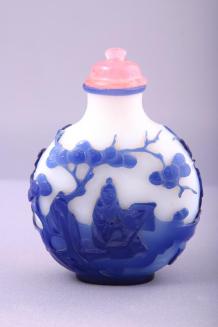 Glass Snuff Bottle with Cobalt Overlay Depicting a sage and attendants in a Garden