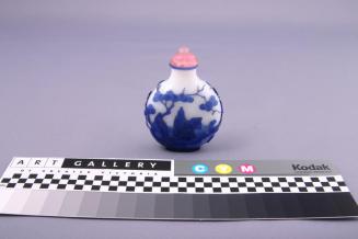 DescriptionBottle is a rounded shape in the A-B cross-section, narrow in the A-C. Material is white glass with blue overlay depicting a sage and attendants in a garden. There is a blue ring at neck edge, a straight neck and a small foot. Stopper is clear pink glass with a knob on top.Colour: white;blue;pink