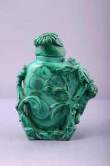 Malachite Snuff Bottle in the Shape of a Vase with Relief Designs of a Cat and a Flower