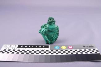 DescriptionBottle is carved in relief in the shape of a vase with a cat and flowers (peony,daisy) wound around it. Stopper is of the same material with a daisy on top.Status