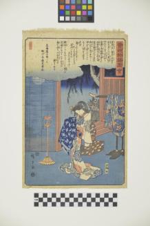 DescriptionInterior scene with woman in Kimono holding a garment of clothing