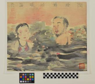 DescriptionHead and shoulder image of a man and a woman in a lotus pond. Chinese characters in black ink across top.Status