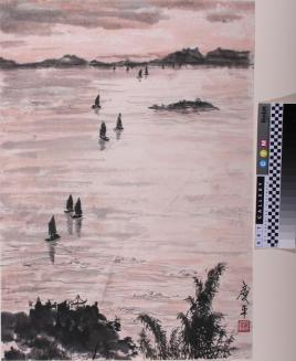 DescriptionSeascape with sunset, small sampans and bamboo in the foreground.Status