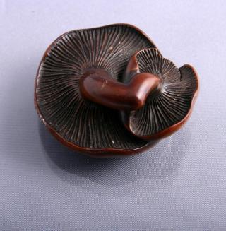 DescriptionWooden netsuke in the form of a large and small mushroom joined at the stems to form the himotoshi.Status