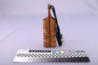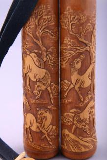 DescriptionTwo tubular bamboo open topped containers are hinged together at top with metal attachments. A blue fabric ribbon is threaded through a metal ring in the metal attachment. Bamboo is carved with a scene of horses, trees and a figure. There is a bone button and buckle in ribbon.Status