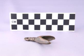 DescriptionBell is hollow and V-shaped at one end and narrow with 3 decorative bands and a perforation at the other end.Status