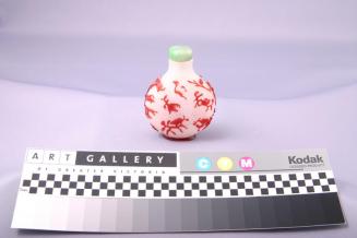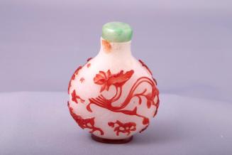 DescriptionBottle is circular in A-C cross-section with a narrow width, a straight neck and a green jade stopper. It is decorated with red glass overlay of fruit and blossoms over a white flecked glass base. There is a small foot in red glass.