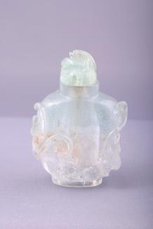 DescriptionBody is carved with a relief design of 2 dragons, heads meeting on one side, legs etc curled around sides and back. Aquamarine is clear with a slight blue tinge. Stopper has as dragon carved on it and is of the same material.Status