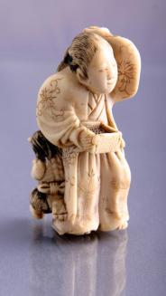 Netsuke: Ivory Figure of a Woman in a Kimono Casting Beans