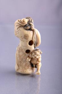 DescriptionIvory figure of a woman in a kimono casting beans from a box to frighten an oni (small figure with horns) hiding behind her kimono. The hair on the two figures is incised and pigmented black. Kimono is decorated in floral motifs; details have been incised.