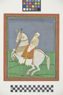 DescriptionA white horse rearing up on it's back legs, is saddled with a nobleman rider with a white beard. Image is enclosed in decorative painted frame-like element. Sketch au verso.Colour: multi