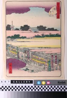 DescriptionSurawaka-cho was the licensed Kabuki theatre area of Edo. The foreground of this scene shows a street filled with many placards advertising the plays and the actors.Colour: purple;yellow;green