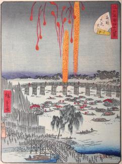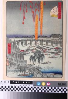 DescriptionHarbour scene with fireworks in the night sky. There are many sampans in the water and a long bridge in the background and a short one in the foreground. Crowds of pedestrians cover the streetsColour: grey;blue;orange;red