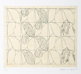 DescriptionA line drawing of a grid with leaf-like patterns, seahorses etc on chine-collÚ background of cream coloured paper