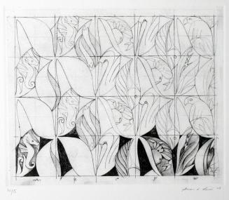 DescriptionLine drawing of grid with leaf-like patterns with birds, fish, seahorses and crabs etc. Bottom portion has sections of solid black and shading.Status