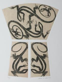 Description'Copper' shape in three sections, each with a chine-collÚ background of buff paper. Each section has depictions of lizards.Colour: black; buff