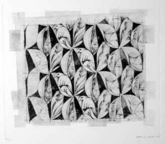 DescriptionLine drawing of a grid with leaf-like patterns with birds, lizards, crabs etc. There is shading overall and some solid black areas.