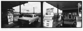 DescriptionExhibition component consisting of one single frame and one double frame black and white image of a gas station.Colour: black; white