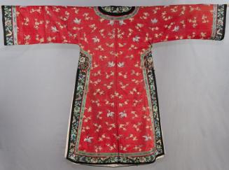DescriptionA red silk robe with a scattered design of cranes and plum blossoms. The garment has a black silk border with peonies and butterflies, flanked with a green silk ribbon figured with butterflies and flower motifs, which is repeated on the collar and cuffs.The robe opens at the right proper front and is fastened at the neck and side with three round metal buttons and fabric loops. The garment is lined with ivory silk.Colour: Red, white, green, blue, purple, yellow, black