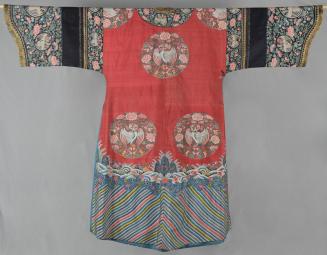 DescriptionA red silk robe with eight roundels depicting circular cranes holding peaches surrounded by peonies and gourds, all above a lower border of waves and multicoloured diagonal stripes. The yoke facings, cuffs and sleeves have matching motifs on a navy blue background. The robe is lined with light blue silk. There are three metal (gold plated?) rosette buttons with silk cord fasteners.Colour: red, blue, black, gold, green
