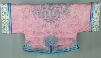 DescriptionA mauve silk damask jacket with applied patterned silk ribbons and blue and white braids arranged in elaborate designs with blue silk edging. The jacket has beige cuffs with embroidery and silk ribbon. The main fabric has patterns of flowers and swords against a field of clouds. There are five rosette metal fasteners with silk cord loops on the open at front right. The jacket is lined with light blue silk.Colour: blue, mauve, green, beige, gold, purple