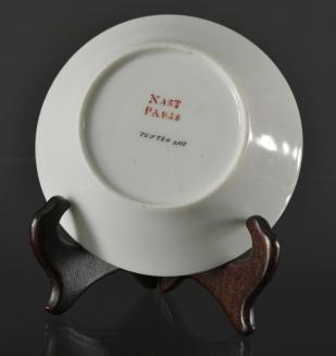 Descriptioncircular dish with straight flared sides and a flat base is decorated in coloured enamel glaze; interior has a pebble pattern in salmon red; central pseudo-armorial shield with motto "Mens conscia recti" (a mind that knows what is right; gilt foliate edge pattern;Colour: multicolour