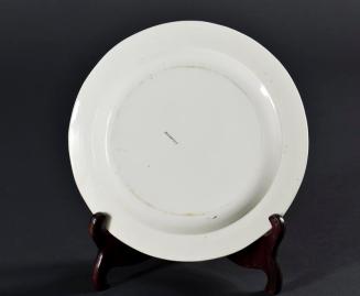 Descriptioncircular white dinner plate has a plain flat raised rim in yellow bordered with thin black lines; black transfer print illustration in the well depicts a landscape view of Lustal, Switzerland