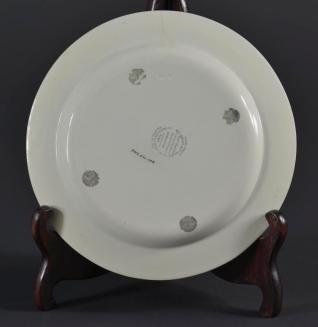 Descriptioncircular white plate has a plain flat raised rim in yellow with a thin black ring on either side; black transfer print illustration in the well depicting a donkey, a man with a large stick and a little dogStatus