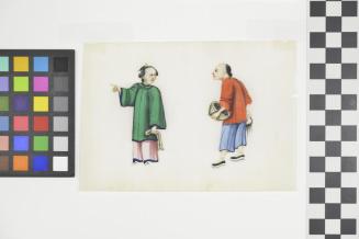 DescriptionScene with two figures; a woman in green points to the left while a man at the right holding a basket looks toward her.Colour: multi-colour