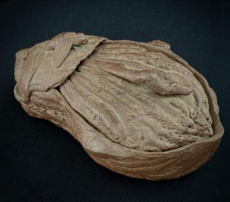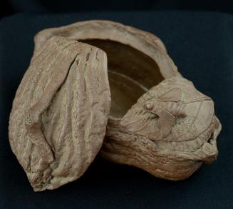 DescriptionContainer is in the shape of a gourd with leaves, portions of vines and a large fly. The lid is the top part of the gourd and has a vine? handle. Container has brown unglazed clay on the exterior and brown glaze on the interiorColour: brown