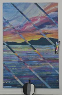 Descriptionabstracted seascape with strips of coloured fabric in blues, whites, pinks, pale orange, and metallics depicting sky, mountains, and water; diagonal blue bars overtop; enclosed in netting with zig zag diagonal stitching;Status