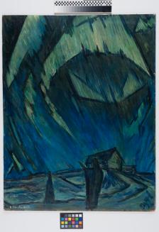 Descriptionview of the sky with the northern lights; figure in foreground and building in background; Expressionist style;Status