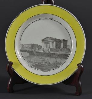 Descriptioncircular white plate has a plain flat raised rim in yellow with a thin black ring on either side; black transfer print illustration in the well depicts a view of Paris with the Palace of the Chamber of Deputies; bridge, water and boats in the foreground;Status