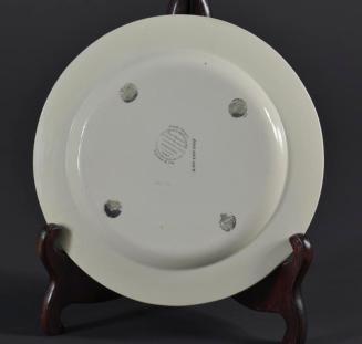 Descriptioncircular white plate has a plain flat raised rim in yellow with a thin black ring on either side; black transfer print illustration in the well depicting the "Conquest of the Kingdom Of England by William the bastard / Year 1066"Status