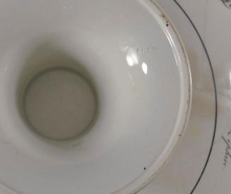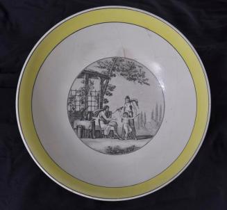 Descriptioncompote dish has a large rounded bowl raised on a pedestal with a small tapered foot; compote is primarily white with the interior rim and base decorated with a band of yellow glaze bordered with thin black lines and transfer prints in black and white on the interior and exterior. Large interior circular print depicts a scene with three classical figures in an Italianate garden. Exterior has four small classical portrait medallions and four small decorative medallions;Status