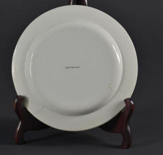 Descriptioncircular white plate has a plain flat raised rim in yellow with a thin black ring on either side; black transfer print illustration in the well depicts a landscape scene with a village (City of Baden Argou, Switzerland);Status