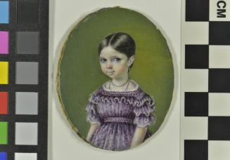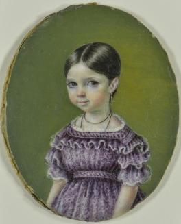 Descriptionminiature oval portrait (head and upper body) of a young girl in a purple dress on a green background; housed in a square wooden frame with an inner brass oval at centre;Status