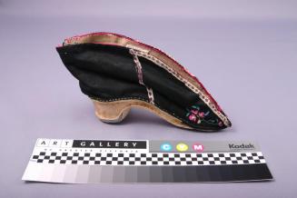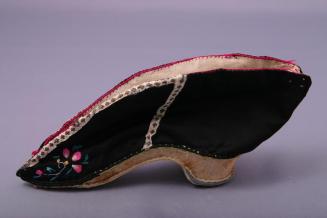 DescriptionShoe for bound feet. Sole and heel are triangular shaped, covered with white cotton with an arched instep. Upper portion is black silk, lined with white cotton with embroidered magenta edges and floral patterns on either side of the toe in magenta, white and turquoise. Some white ribbon trim.Colour: black;magenta;white;turquoise