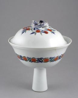 DescriptionWhite lidded stem bowl with tou-ts'ai enamels design of a peach spray band on sides and on lid, centre of lid with relief gnarled branch;Colour: white; red; blue; green