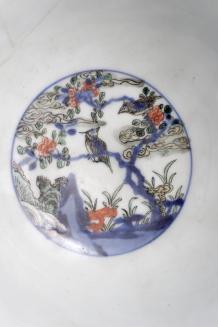 White lidded stem bowl with underglaze blue and overglaze enamel design