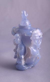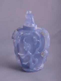 DescriptionBlue chalcedony snuff bottle with carvings of a woman, a man, birds, trees and shrubs. Stopper is also chalcedony with bird on top.Colour: blue