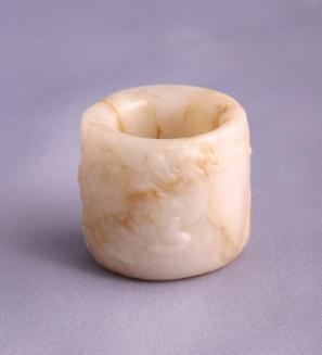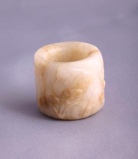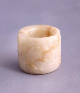 DescriptionTubular ring in white and brown stone with raised relief carvings of a deer? and plants around exterior.Colour: white; brown