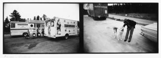 DescriptionExhibition component consisting of one double frame and one single frame of gas station, vehicles, dog etc.Colour: black; white
