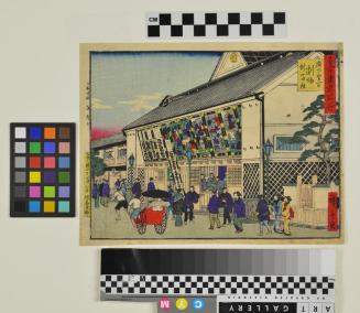 DescriptionKabuki theatre (Shintomi-za) building with banners and pictures decorating the front and pedestrians and rickshaw in the street.